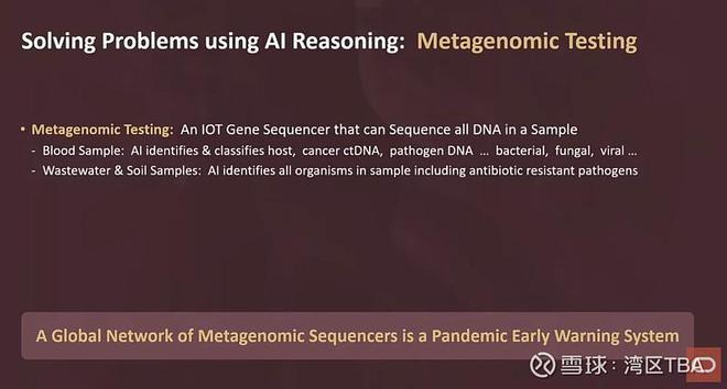这是一种新的传感器,它能直接对样本中的所有东西进行基因测序。你取一份血液样本,里面显然有你自己的基因。在你自己的基因中,包含着一种叫做ctDNA,即循环肿瘤DNA的东西。所以,在每个人的血液中,如果你有癌症,即使是早期的一期或二期癌症,你血液中也会有微小的循环肿瘤DNA片段,我们可以通过对血液中所有活体进行基因测序来发现。过去人们尝试利用循环肿瘤DNA,但问题在于,你的免疫系统会治愈很多癌症,而你甚至都不知道自己得过。在你有症状之前,免疫系统就已经清除了很多癌症。如果我们一直告诉你:“天哪,我们发现了这个癌症,需要开始治疗。”但实际上并不需要,你的免疫系统会处理掉它。所以假阳性在这里是致命的。然而,现在有了AI,我们可以分析这些片段,区分假阳性和需要立即早期治疗的真正严重问题。这有望为我们带来非常早期的癌症诊断,大家都知道,这会大大提高癌症治疗的积极结果的可能性。