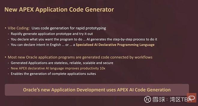 顺便说一句,我不知道你是否听过这个词,我第一次听到时觉得有点奇怪,“Vibe Coding”(凭感觉编程)。听起来很Z世代。就是说出你希望程序做什么,生成原型,然后试用一下。不要想得太复杂,就是凭感觉来。但实际上,你可以用英语直接生成计算机程序。我个人曾和甲骨文的其他工程师争论过,使用英语作为编程语言是否是个好主意,因为英语是出了名的不精确。如果我们想生成程序,创建一个定制的、高度精确的声明式语言不是更好吗?这正是我们在甲骨文使用Apex所做的。我们为Apex添加了一种声明式的AI生成语言来创建应用程序。但外面还有很多人仍在使用英语,那也行。这取决于你,我们不为你做决定。我们只是确保你有选择。