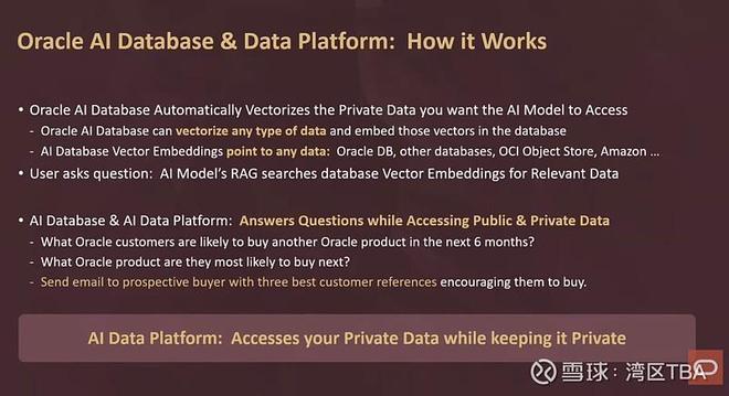他们推出了一个叫“AI数据库26ai”的东西。它允许所有顶级AI模型,直接在你公司的私有数据上进行推理。而且数据永远不用离开保险库。