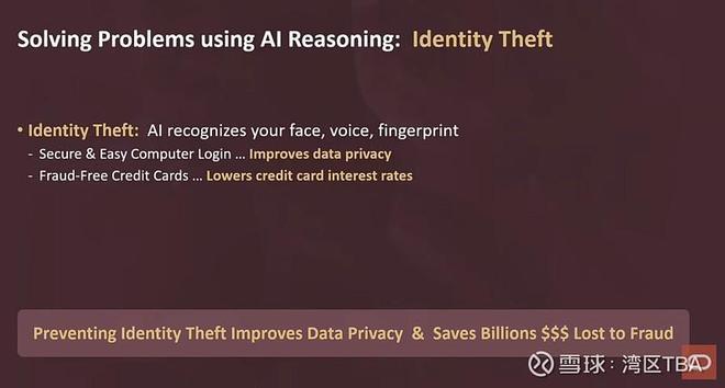 好的。这些是我们正在做的一些事情。我们可以逐一来看。我们正在研究生物识别技术,可以用AI防止身份盗窃。所以,不再有登录,不再有会被盗的密码,不再有入侵,不再有数据被盗,不再有信用卡被盗用后你得换新卡。我们可以让所有信用卡都防盗刷,如果你想要的话。