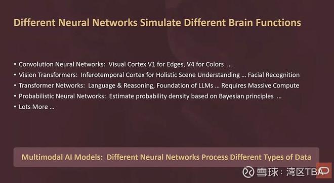 在构建一个AI模型时,你使用一个不同的神经网络来处理视觉,也就是看到某个物体,看到它的边缘、形状、颜色,看它移动。你用一个神经网络来看见它,然后用一个完全不同的神经网络来识别它是什么,辨认它。接着,用第三个神经网络来对其进行分类、组织和利用这些数据进行推理。所以,现代AI系统和现代AI模型与我们的大脑非常相似,是一个多模态模型。它有多个神经网络来处理不同类型的数据,如视频数据、文本数据、听觉信息等等。