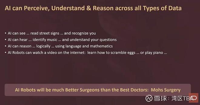AI机器人将成为比最顶尖的医生更出色的外科医生。有一种非常著名的手术,由莫氏(Mohs)医生开创,他会从病人的脸上切除癌变组织,并因此闻名,因为他造成的损伤最小,切除的皮肤组织最少,所以美容效果极佳。他的做法是,切下几层皮肤,然后拿到显微镜下观察,看是否已经切到健康的细胞,即癌症的深度。他就在手术台和显微镜之间来回操作。切一点组织,用显微镜看一看,再切一点,再看一看。然而,AI机器人可不按常理出牌。它们的视觉,机器人上的视觉系统,是微观级别的。它们不需要显微镜就能看到单个细胞。它们不需要显微镜就能分辨出癌症组织和健康组织的边界。它们的协调性,正是如此。它们是比我们更好的外科医生。不是因为它们比我们更聪明,而是因为它们有更好的手眼协调能力。它们的眼睛比我们的好得多,手的精确度也比我们的高得多。所以,它们可以在一层健康细胞和一层癌细胞之间进行切割。观看这个过程真的令人惊叹。这会让我们所有人都感到安心,当我们去看医生,知道他会用机器人来做手术时,手术将会是完美的。