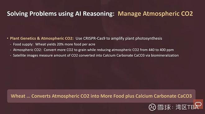 有了AI设计的小麦,这些二氧化碳最终去向哪里,实际上取决于我们。我们可以选择将吸收的二氧化碳转化为碳酸钙。这正是珊瑚礁的形成方式。我们可以让小麦、玉米、大豆将二氧化碳转化为碳酸钙,从而将其永久地从大气中移除。所以,如果你想把大气中二氧化碳的浓度从目前的百万分之440降低到百万分之400,你可以通过让农作物这样做来实现。你可以将大气中的二氧化碳水平管理到你认为合适的任何水平。当然,不要降到零,那所有植物都会死。但从440降到400可能是稳定气候的最佳点。而且这样做基本上是免费的。