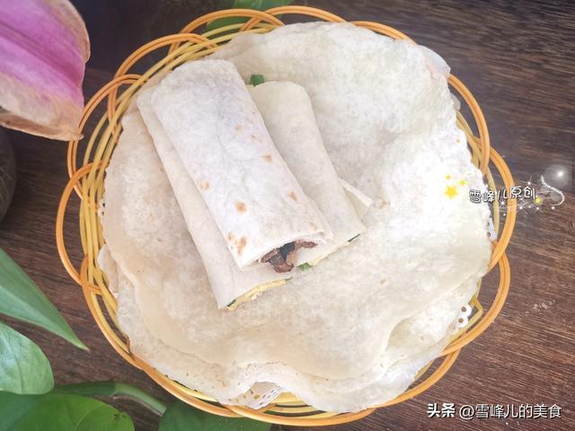 2,面粉烫过之后,稍微凉一会儿,用手揉匀揉光,揪成大小一致的小剂子,搓圆按扁,擀成薄薄的面皮,放入平底锅中烙熟出锅即成,卷喜欢的菜肴。