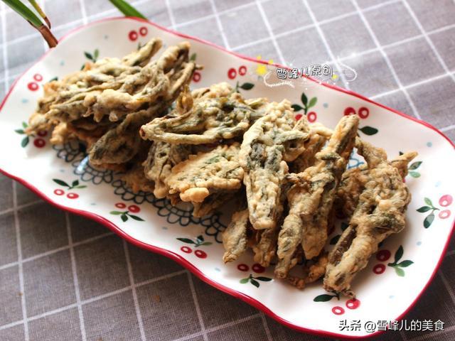 【香椿鱼】食材:香椿芽适量,面粉少许,玉米淀粉少许,盐适量,鸡蛋1个,花生油适量。
