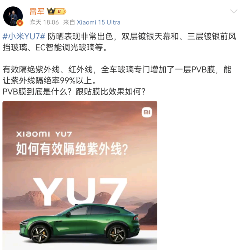 近期,小米汽车旗下的YU7车型在紫外线防护方面展现出了卓越性能。雷军通过一张图片,向公众展示了该车在隔绝紫外线方面的强大能力。据数据显示,小米YU7的前风挡紫外线隔绝率高达99.5%配资网大全,而前门窗、后门窗、普通天幕以及EC智能天幕的隔绝率更是达到了惊人的99.9%。即便是后角窗,也拥有99%的优异隔绝表现。