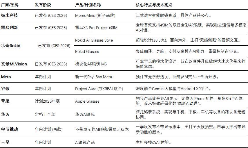 2026年AI眼镜行业部分新品发布及规划概览